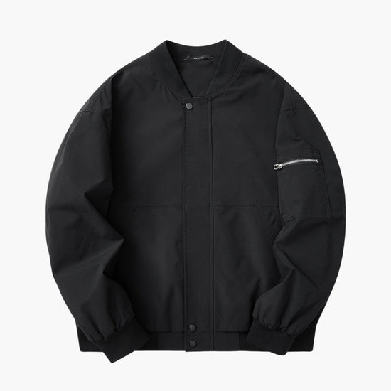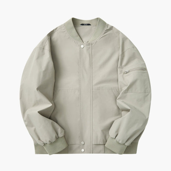 A streamlined bomber jacket crafted in a soft neutral tone with a clean zip front design.