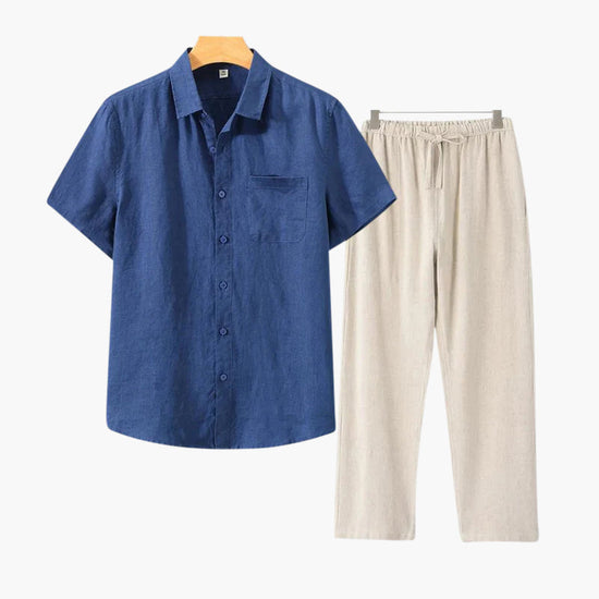 A lightweight two piece set featuring a breathable short sleeve linen shirt and relaxed drawstring trousers.