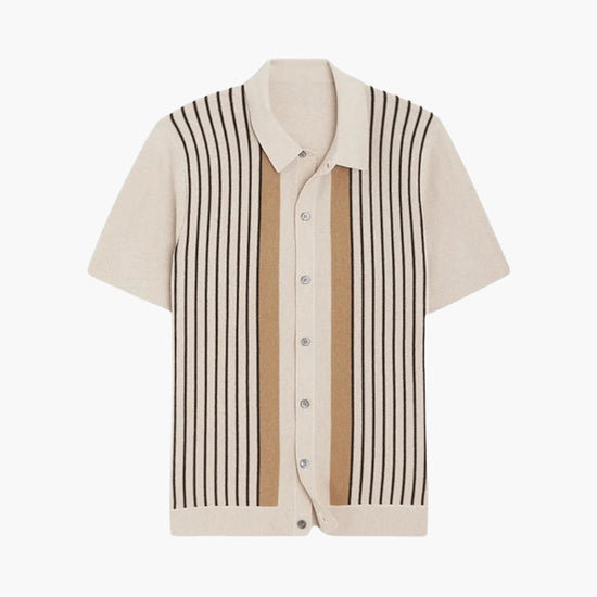 Statement short sleeve knit polo featuring bold vertical stripe detailing.